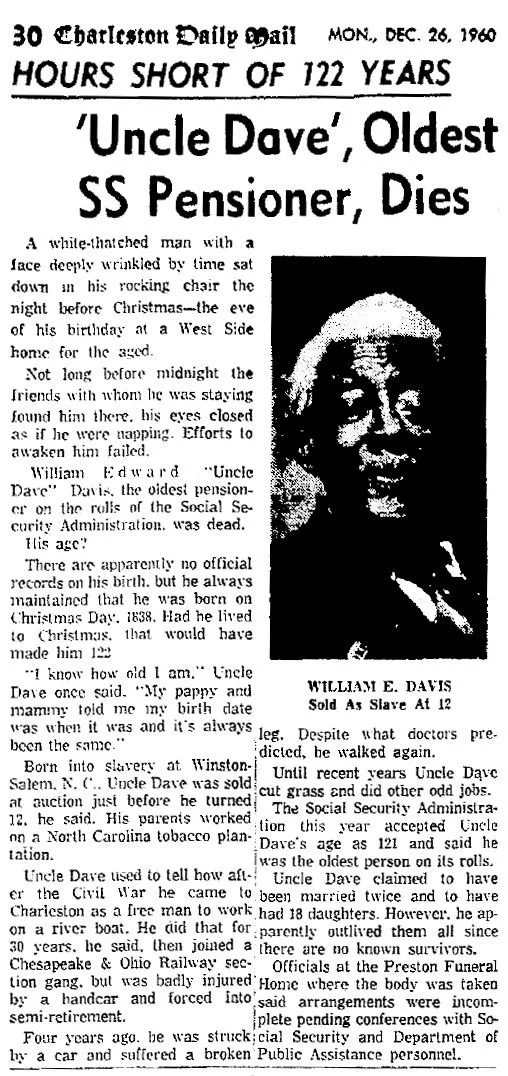 William Edward Davis (1838-1960) was the oldest pensioner receiving social security at the time of his death at age 121. There are no records of his birth, but he maintained he had been born on Christmas Day 1838. He was born into slavery at Winston Salem, N.C., and his parents worked on a tobacco farm. He came to Charleston as a free man after the Civil War and worked on a river boat for 30 years and later for the C&O Railroad. He claimed to have been married twice and had 18 daughters.